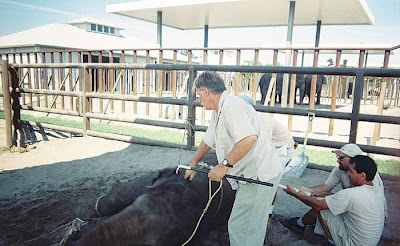 In case the youngster doesn't want to co-operate, a trainer stands by with one of the sharp metal hooks used to manage the animals.